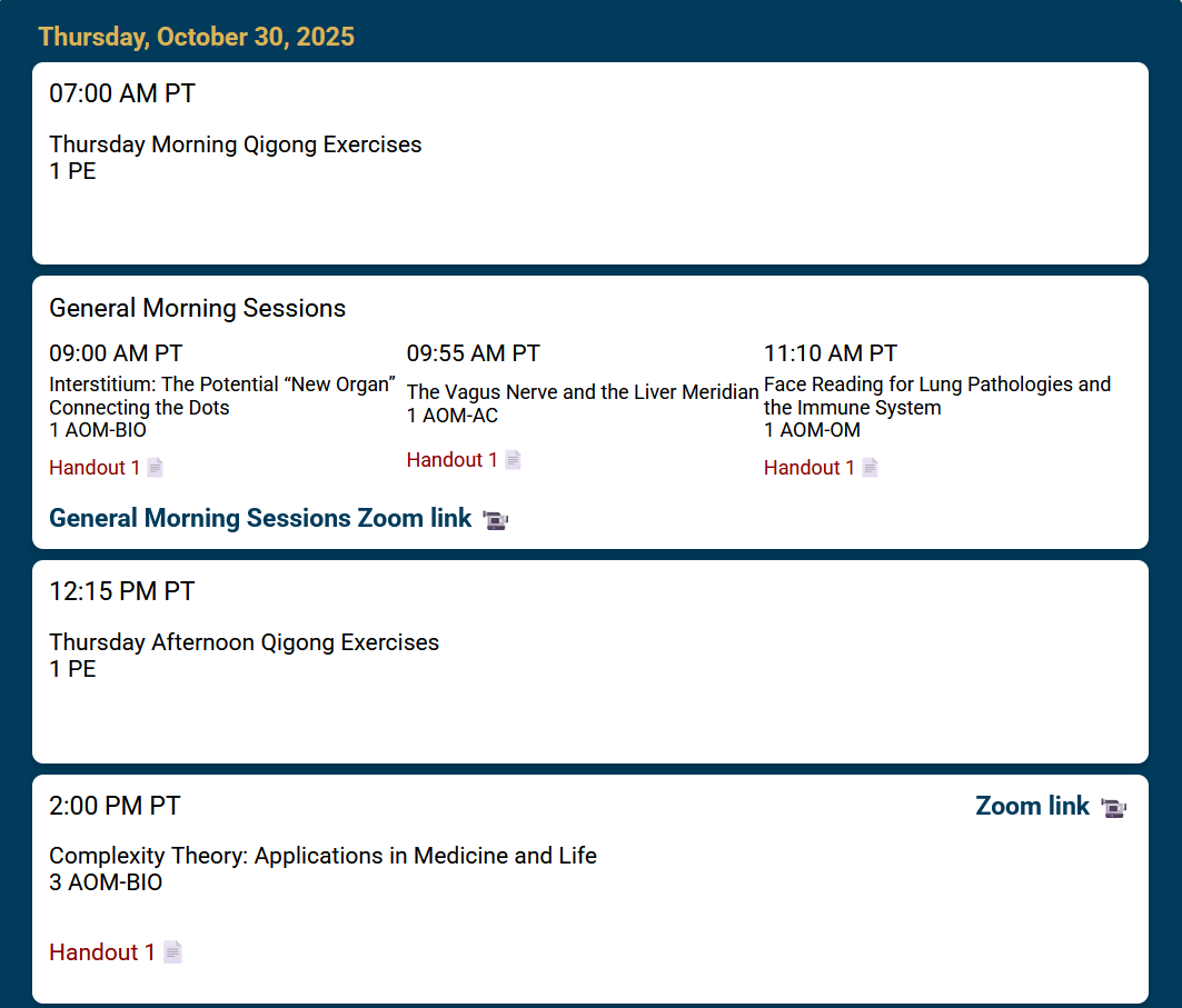 - Scroll down to the appropriate day and time. You will see any available handouts and a Zoom link if that class is being streamed. Some speakers may choose not to provide handouts or presentation slides to share. On-site attendees should not join the livestream while attending the class in person. After the conference, the Zoom link will turn into the recording link for you to review.